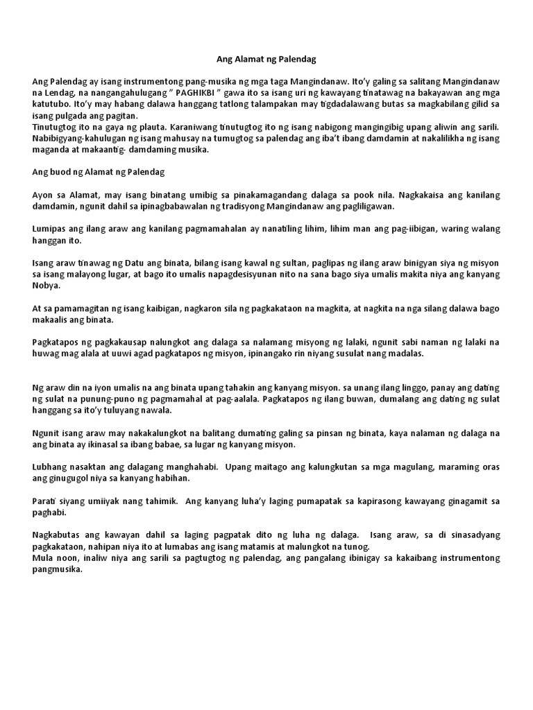 Read free for 30 days. Buod ng Alamat ng Palendag. Alamat ng palendag Gawa ito sa isang uri ng kawayan tinawag na bakayawan ang mga katutubo ito y may habang dalawa hanggang tatlong talampakan.