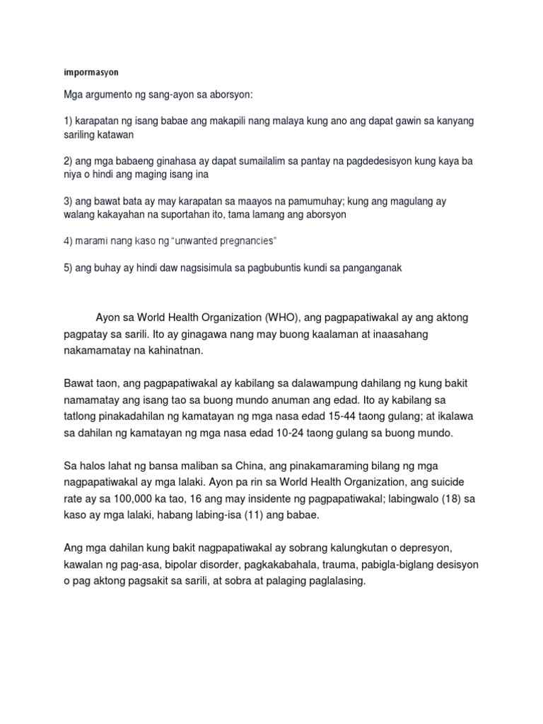Una dapat nating tandaan na ang ganitong sitwasyon ay napakaliit lamang na porsyento sa mga kaso ng aborsyon na nagaganap sa buong mundo. - Complete aborsyon ganap na paglagas o pagtanggal sa namuong buhay sa sinapupunan. Buod ng mga Argumento Sa ibang mga bansa legal ang gawaing aborsyon.