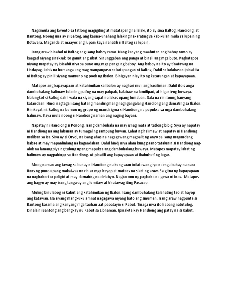 Tatlong magigiting na lalaki ng Ibalon na sina Baltog epikong. More summaries of Philippine literary works will be added here soon. Ito ay isinalaysay sa anyong berso ng isang manunula na si Kadunung.