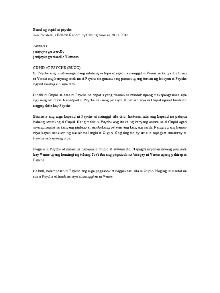 BUOD ng Cupid at Psyche. It is the responsibility of each user to comply with 3rd party copyright laws. Ngunit sa lahat siya ang may pinakalutang na kagandahan.