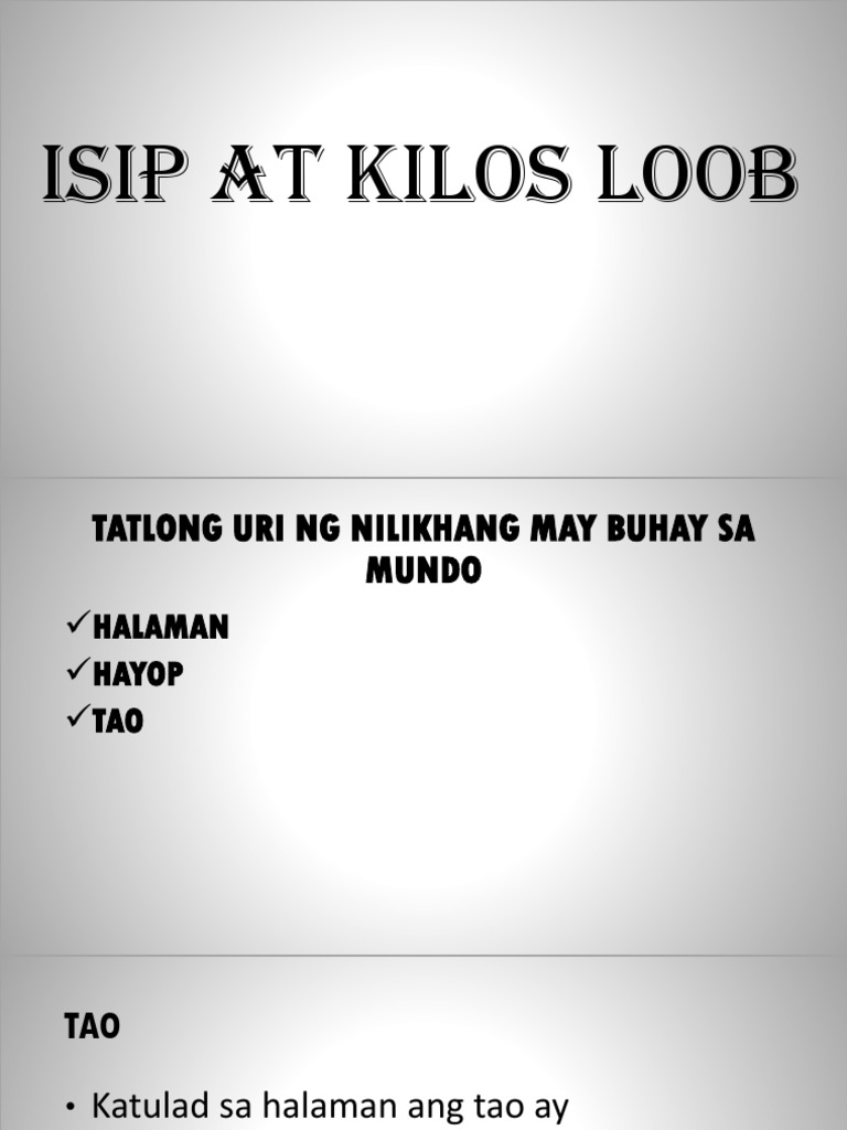 Log in Sign up. KILOS-LOOB Samakatwid ang isip at kilos-loob tulad ng katawan ay kailangang sanayin at linangin upang magampanan ng mga ito ang kani-kanyang layunin. Ang isip ay ginagamit.