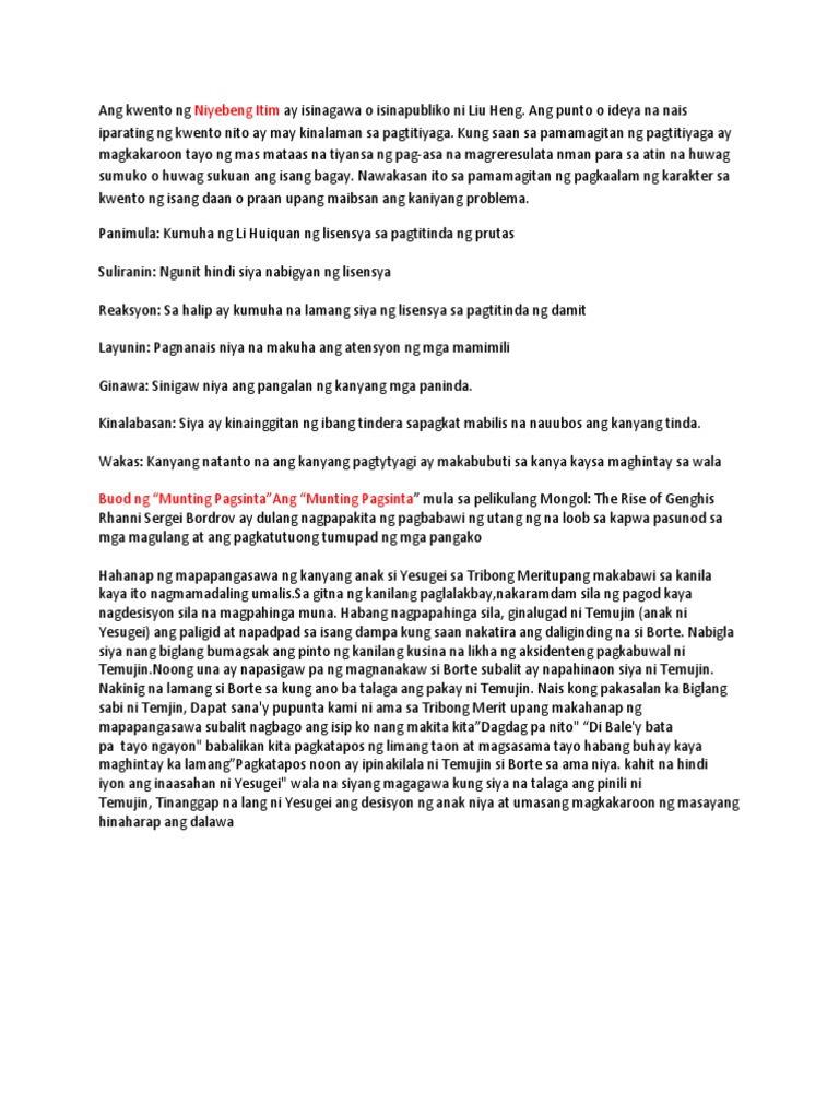 Buod Bisperas ng bagong taon noong nagpakuha si Li Huiquan ng labinlimang litrato kasama ang kaniyang Tiya Luo. Tutol man na magpakuha ng litrato ay napilitang magpakuha si Huiquan sa Red Palace Studio. View NIYEBENG ITIMpptx from BSED 109283 at Philippine Normal University.