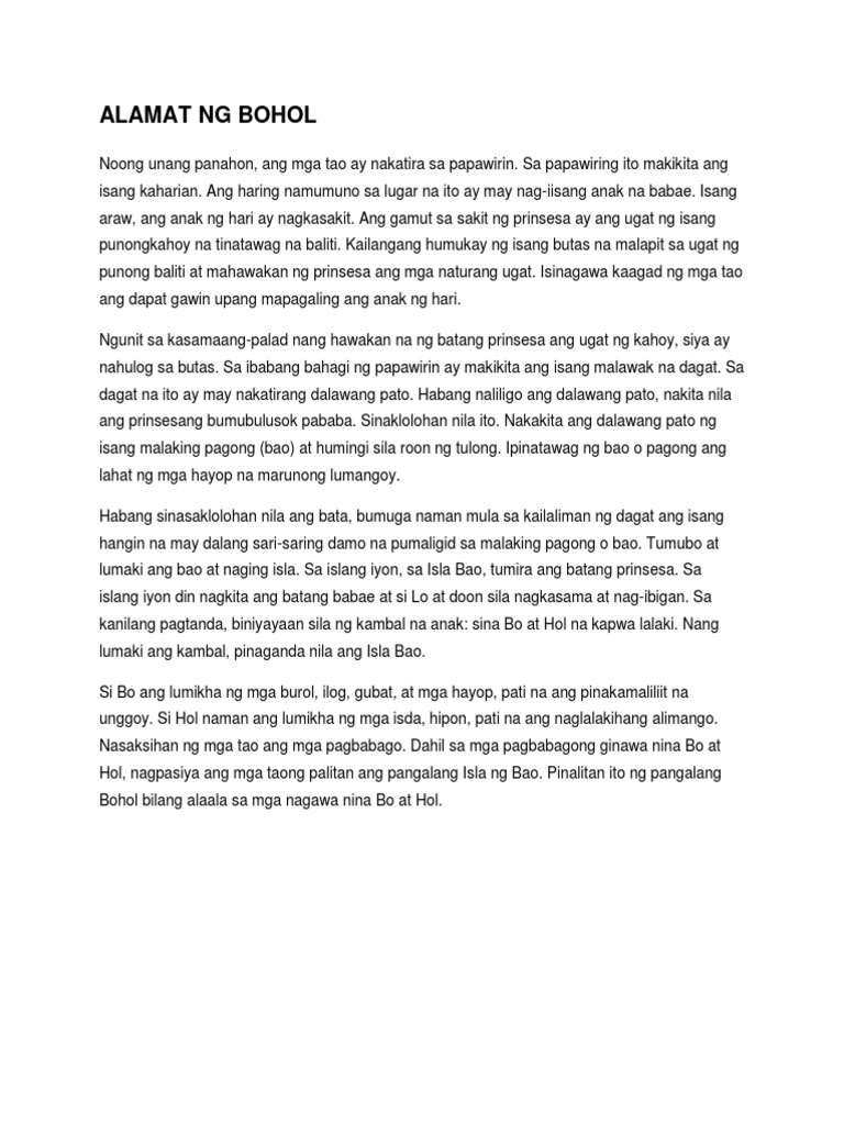 ANG PINAGMULAN NG BOHOL ALAMAT NG BOHOLANOS Ang mga tao noon ay naninirahan sa kabila ng ulap. F Noong unang panahon ang. Results for ang alamat ng bohol buod translation from Tagalog to English.
