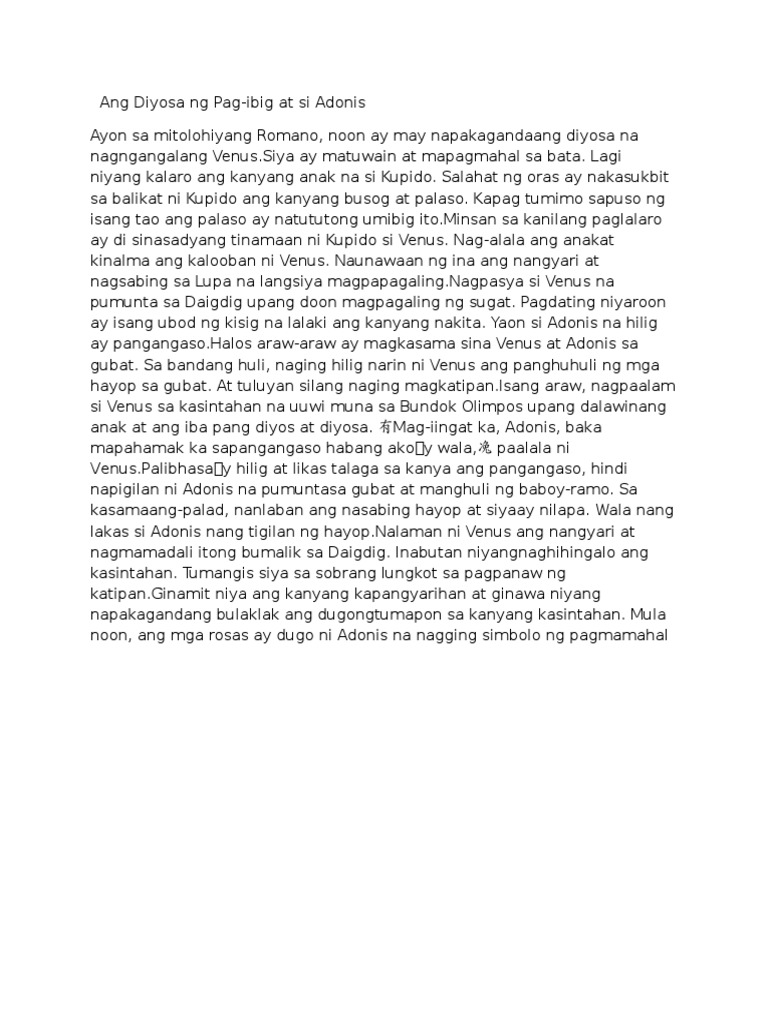 October 18 2018. This document was uploaded by user and they confirmed that they have the permission to share it. Ang Diyosa ng Pag-ibig at si Adonis Ayon sa mitolohiyang Romano noon ay may napakagandaang diyosa na nagngangalang VenusSiya ay matuwain at mapagmahal bata.