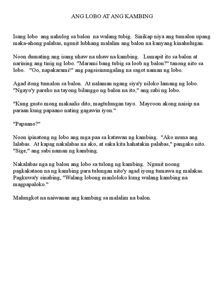Ang Lobo at Ang Kambing Isang lobo ang nahulog sa balon na walang tubig. Sinikap niya ang tumalon upang maka-ahong palabas ngunit lubhang malalim ang balon na kanyang kinahulugan. Hoy Lobo galit na sigaw ng Kambing.