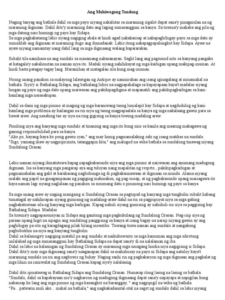 Ang Mahiwagang Tandang Naging tanyag ang bathala dahil sa mga payo niyang nakalutas sa maraming sigalot dapat sanay pinagmulan na ng maraming digmaan. Hindi dapat mawalan ng pag-asa dahil lahat ng masamang nangyayari ay may rason sa Diyos. Results for buod ng kwentong mahiwagang tandang translation from Tagalog to English.